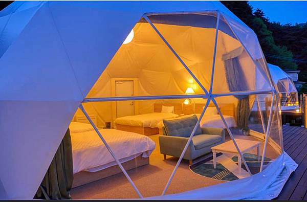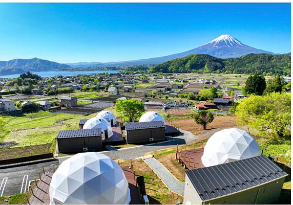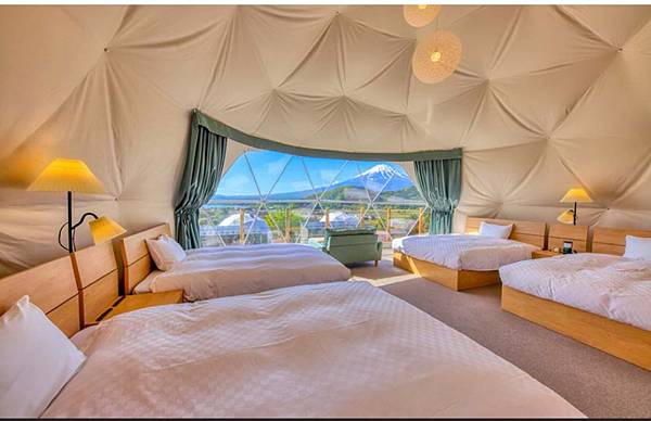 「グランファーム富士河口湖」的豪華露營渡假村於四月正式開幕,距市中心約90 分鐘路程。每間客房均享有富士山和河口湖的全景,每天僅接待 5 組;園區內有總計「五個」圓頂帳篷,每棟樓與圓頂帳篷相鄰都有自己的用餐空間、浴室空間和衛生間。