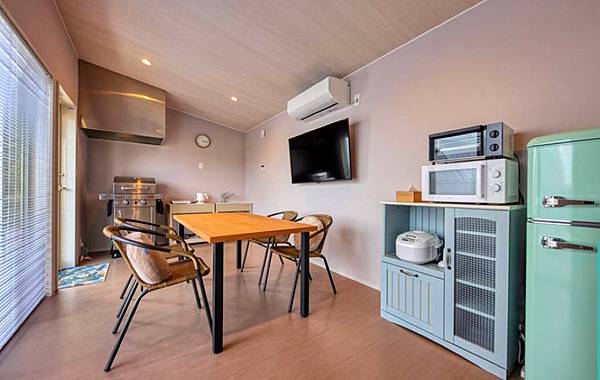 園區有全天候專用BBQ空間並設置大型燃氣烤架,可由渡假村提供早晚食材由自己烤(不要以為包含早晚是別人幫忙用好的喔) 。 也可自行購買食材,使用室內廚房以及燒烤爐(免費提供)。園區鄰近超市提供山梨新鮮蔬菜、葡萄酒牛肉以及魚等等。