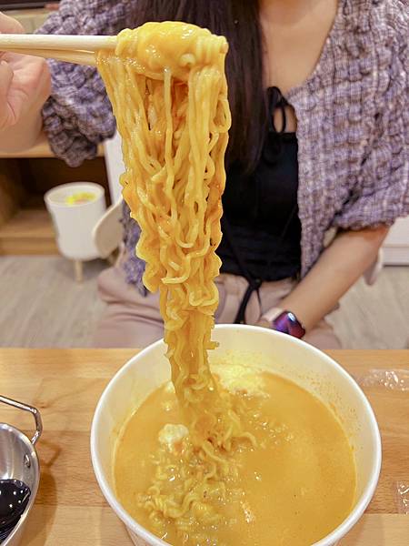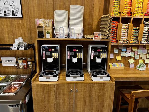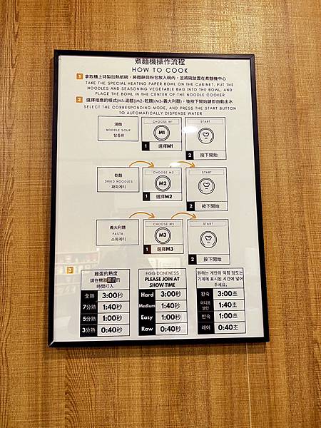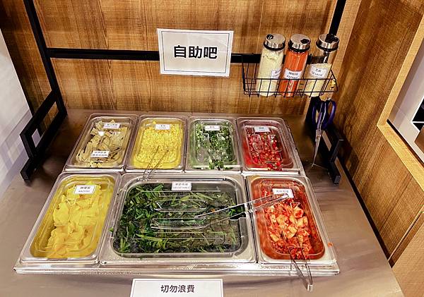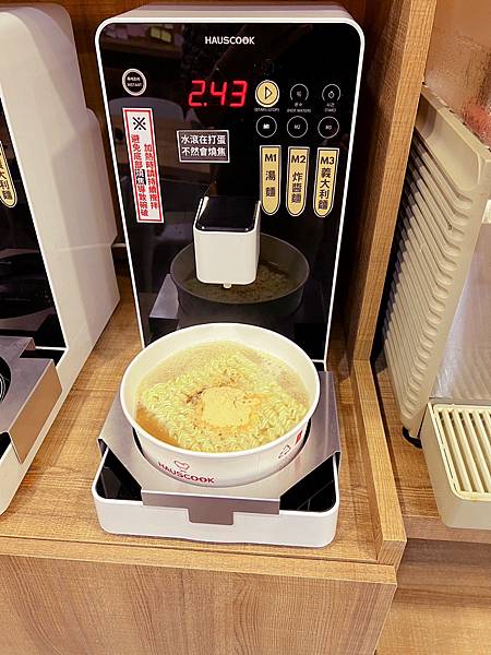 然後依據煮麵機操作流程操作,熱騰騰的麵就完成啦,蛋跟起司何時放都寫的非常清楚。現場還有配料免費夾,自助區有醃漬黃瓜、玉米粒、蔥花、泡菜與季節時蔬,紅茶與果汁隨你喝~~但冰箱內的飲料及蔬肥要另外付費喔 。