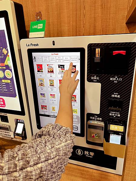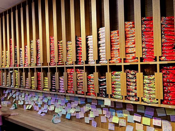 先到自助機器選擇想吃的口味,韓國泡麵包約80元~90元左右,可以另外加蛋或加起司,最後用現金或電子支付,相當方便。選擇好之後就到滿滿韓式拉麵牆選取你點的口味。