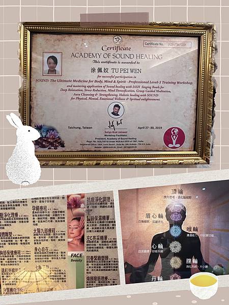 身體SPA:能量精油順氣課程、頌缽課程、 經絡理療、婦科卵巢保健、胸部保健、孕婦療程、妊娠紋改善、腦壓淨化,油壓以及無痛刮痧,專屬客製化抓周調油~一對一諮詢下知道我有蕁麻疹,調整適合我的精油,加上老師擁有國際證照,讓我放心不少。