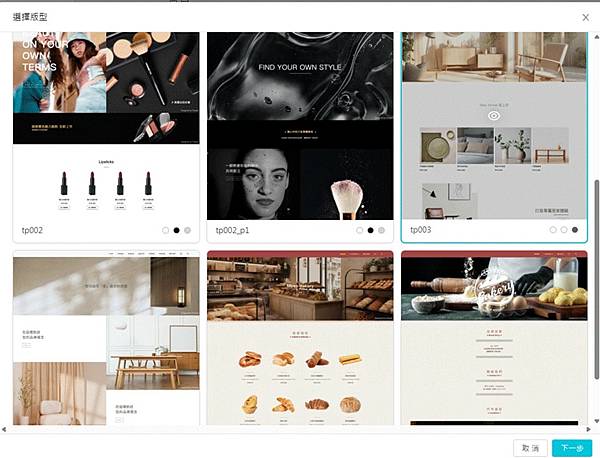 一開始先選網站版型,預設就有非常多可以選,選定之後再針對每個區塊上傳你想變更的圖案與文字。